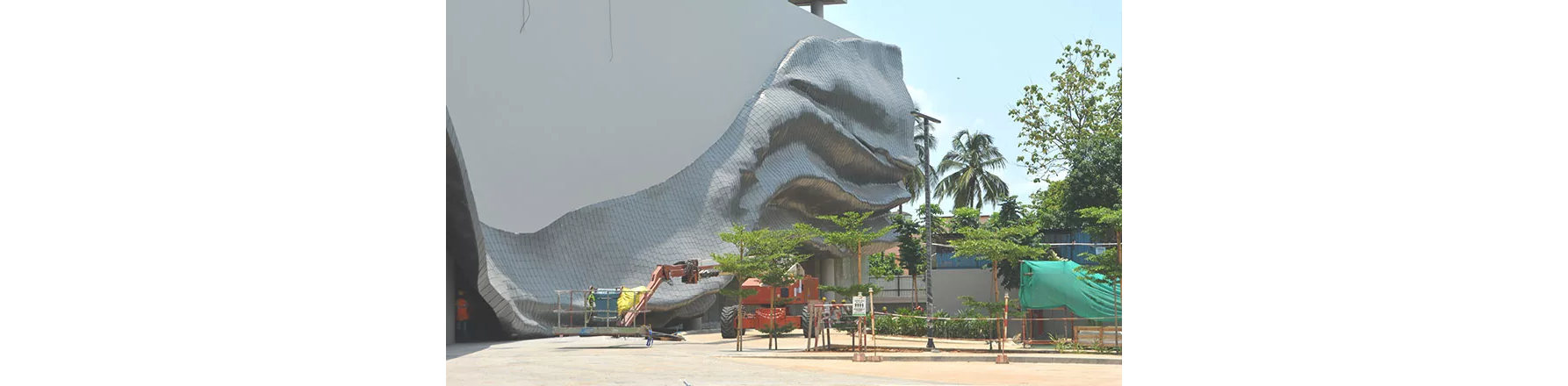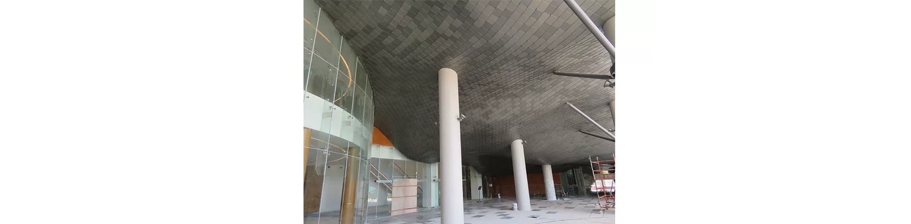Zinc cladding for the free form wrap structure, cladding panels are formed in a fish scale patterns to achieve the complex fluidic geometry smoothly. BES team has deeply involved in the site construction of freeform canopy and wrap structure, helped the site team to implement correctly as per the facade and details.